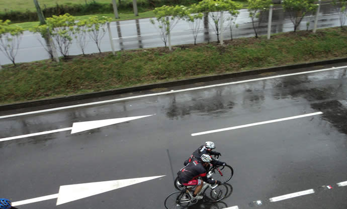 La lluvia se intensificó, un adagio reza: “ciclista que se respete no se moja…”, pero ya no había nada que hacer entonces mejor complementamos el adagio “…a menos que el agua lo coja montando”.