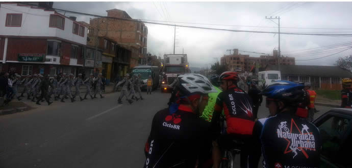 Sorpresivamente el sol se asoma entre las nubes parece que le causó curiosidad ver ese gigantesco lote de ciclistas uniformados de negro y rojo. Al llegar al centro de Funza, nos tenemos que detener un buen rato hasta que pase un desfile de bandas de colegio, justo hoy esa población estaba cumpliendo sus 476 años, Alvarito Cuervo se veía fascinado pues estaba en su patria chica, parecía evocar su época de colegio.