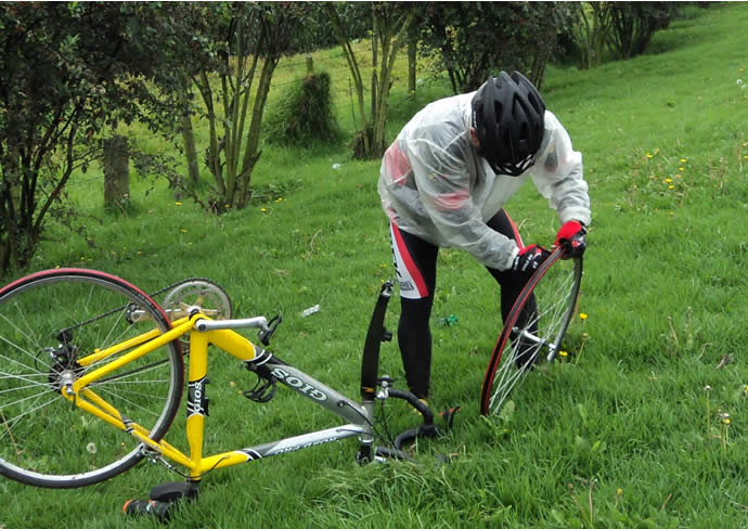 Observamos que el amigo Carlos Galindo se dirige a la berma y parquea su bici, 28 pedalistas y preciso la tachuelita le tocó a él. Ni modo, la primera obra de misericordia para Huguito como conductor elegido, colaborarle al pinchado. El lote siguió impávido, qué pena con Carltos, pero todos parecían ansiosos por llegar al inicio de la montaña en la vía a Zipacón para probar si el entrenamiento de la semana les sirvió.