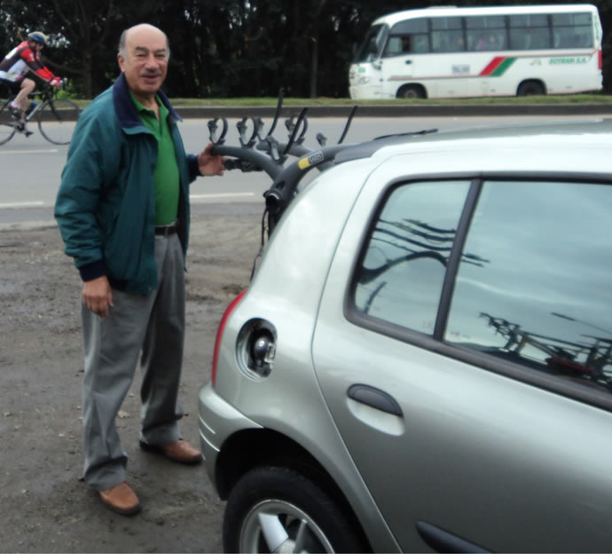 7:20 a.m. Al llegar con sorpresa veo que Hugo Gutiérrez ya se encuentra en el parqueadero en los Kioskos, fue el primero en llegar, le correspondía hoy su turno como conductor elegido. Interrumpió su vacaciones de abril y se vino de Carmen de Apicalá expresamente para cumplirles a sus amigos ciclistas, oigan, nos trajo tremendos bananos, parecían plátanos hartones. Muchas gracias Huguito.