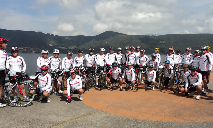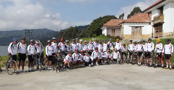 De pronto vi a lo lejos un grupo grande de ciclistas, con camisetas blancas. Puse una relación más fuerte y me dispuse a alcanzarlos, con la esperanza de que me pudieran acompañar en este hermoso viaje en bicicleta. Finalmente les llegué (), entonces quedé perplejo, fui reconociendo uno a uno los rostros de mis amigos y colegas, Pulga, Melqui, Diana, Gabriel. Jorge, Esther, Marcolino, Nobile, Hermes, William, Jacinto, Eduardo, Pedro, Pablo, Fernando William, Alejo, Pacho, Nelson, Camilo, Hugo, Álvaro, Ilde, Giacomo, (perdón, por si se me escapa algún nombre )… en fin inexplicablemente allí estaban todos, me contaron que el lote conmigo llegaba a 36 pedalistas.