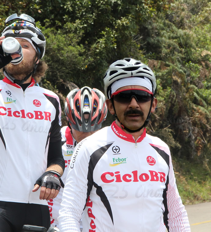 Estaban todos felices. Ya de cerca pude detallar el uniforme que lucían, camiseta de un blanco intenso, con cuello y puños rojo y negro, unas suaves líneas formaban un curioso diseño de color rojo a la izquierda y negro a la derecha, logos de Febor y Asopenbre; pantaloneta negra con un triángulo en el que se leía “CicloBR 25 años”. Me gustó ese traje de ciclismo, se veían tan elegantes… pensé qué bueno poder lucirlo, me sentiría orgulloso.