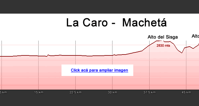 Entonces decidimos pensar en una visita a la población de Machetá en Cundinamarca partiendo de La Caro, idea que se cristalizó felizmente hoy, con la participación de , y un recorrido de 122.6 kilómetros y seis horas, uno de los más duros que hemos hecho. El récord este año lo tenía la visita a Cachipay con 101 kilómetros y la subida a Guasca con 96 kilómetros.