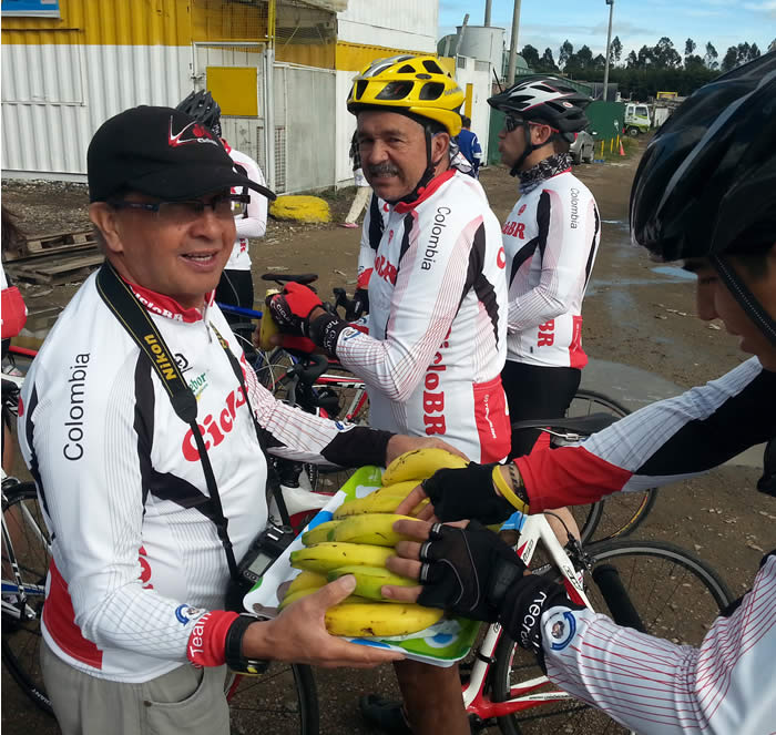 El conductor elegido, Armando Torres y reportero gráfico de la fecha, ya recuperado de la tragedia por la pérdida de la octava estrella de su Santafecito del alma, hoy se preparó con todas las de la ley para el avituallamiento de sus compañeros ciclistas, traía bandejas con gansitos de chocolate, bananos y en su vehículo una neverita de Icopor con hielo y jugos de cajita que reservó para más adelante.