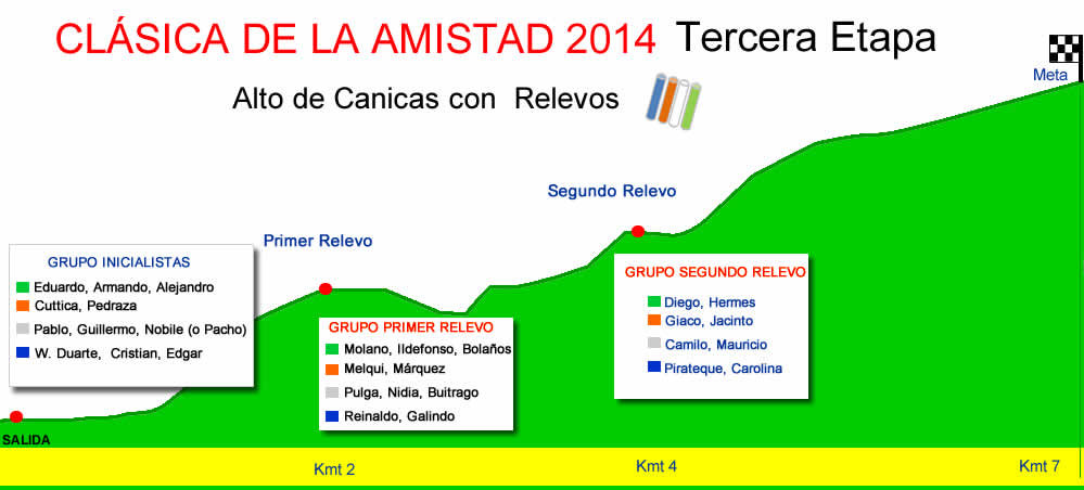 Este grupo inicia su labor en el Km4 y concluye la competencia en la meta final en el Alto de Canicas. |