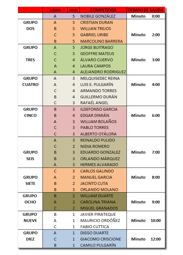 Para evitar el riesgo del manejo de un grupo grande en competencia en carretera abierta, la salida será por grupos. Conformamos diez buscando lal mayor homogeneidad posible. La primera en salir será Nobile con una ventaja de 12 minutos sobre los duros de la A.