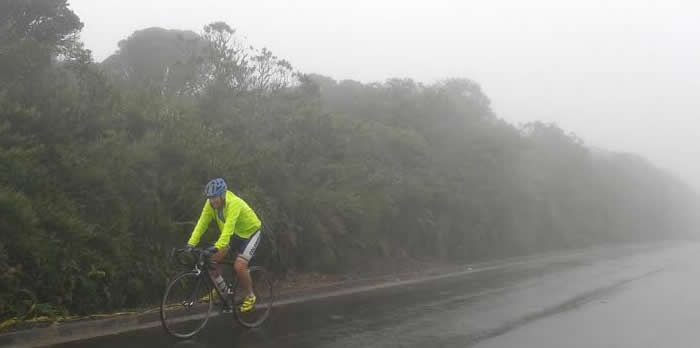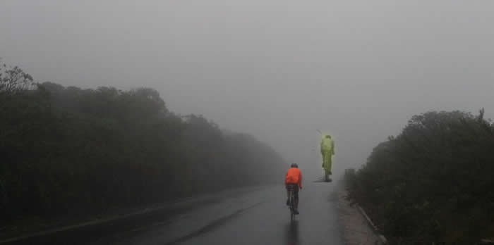 Era como estar en una película en blanco y negro, mas bien gris gris por los tonos de la neblina. Mi mente andaba en esas cuando Giaco me mira y me dice…"que Bello todo esto!!"…la lluvia, el frio, la subida, la gente q te anima, los ciclistas/fantasmas..enfin el Ciclismo!!