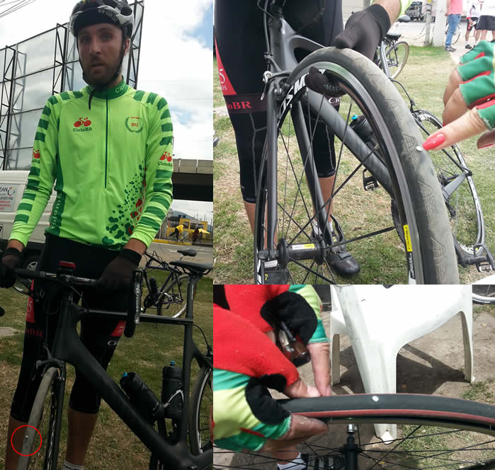 Por supuesto soltamos la risa, pero como si aquello hubiese sido una maldición soterrada curiosamente a pocos metros se inició una sucesión de pinchazos; Bolaños fue el primero, Giaco se quedó para asistirlo mientras llegaba el carro con las ruedas. Unos metros más adelante Dimían, a poca distancia Jason estaba esperando asistencia, también había pinchado. Pero la racha seguía, luego le tocó a Jacinto y ya en Subachoque a William Duarte.