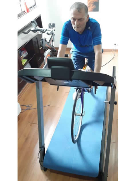Alberto cuenta que hace 40 minutos con inclinación del 4% aceleraciones de 3 minutos y recuperación de 5, con eso aspira a ganar rendimiento cardiovascular y fortaleza muscular. "Es una buena forma de soportar la cuarentena y de prepararme para mi regreso a CicloBR, cuando se controle la pandemia y finalice el encierro".