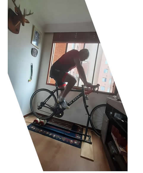 Pachito había suspendido el ejercicio por su novedad en la columna, pero como la curva seguía creciendo exponencialmente entonces a raíz de la cuarentena volvió a la antigua rutina; montó su bici sobre los rodillos de tenedor y allí hace hasta 50 minutos, viendo videos de carreras de Nairo y otros ídolos nacionales y clases de spinning.