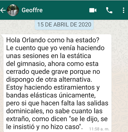 "He estado al tanto de todo lo que escribes y también de lo que escriben nuestros compañeros. Yo no tengo ahora mi rodillo porque se lo presté a un sobrino que es triatleta para que siga entrenando en su casa pero estoy siguiendo una rutina que un profesor hace a diario para mantenimiento en esta cuarentena.