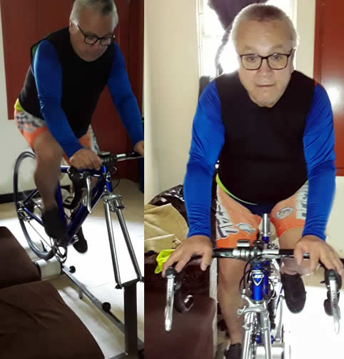 Lo bueno es que Camilo su hijo, si está en la jugada. Tiene un simulador con rodillo inteligente, que le mide de todo; además puede escoger una ruta, plana o montañosa y la máquina lo pone a trabajar más o menos duro. Lo malo es que le toca ir hasta el apartanento de Cami. Lo bueno es que el vive en el mismo conjunto.