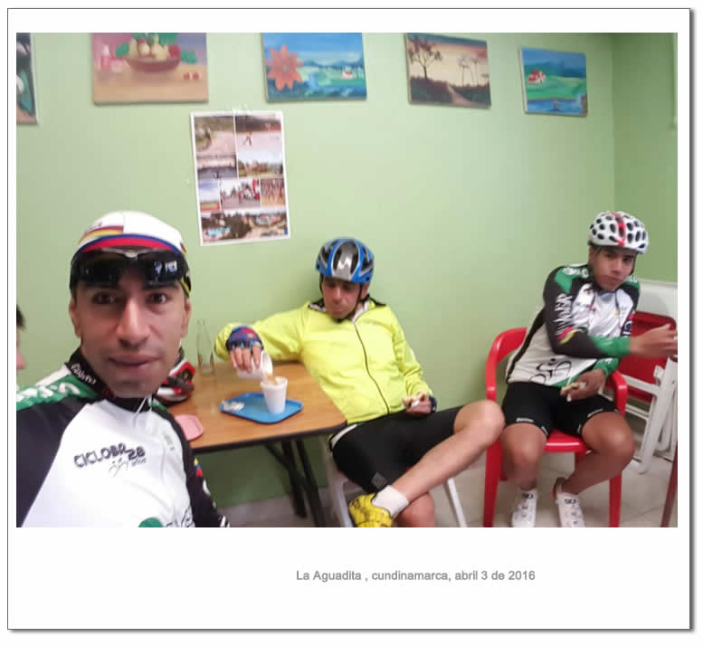 A la llegada a Agua Bonita ya se encontraba Diego y William apoderados de dos buenos tazones de aguadepanela con queso, Manuel comió unas galletas y un jugo, ración que a la larga fue poca y tuvimos que parar más delante de Sibaté porque le estaba dando la pálida.
