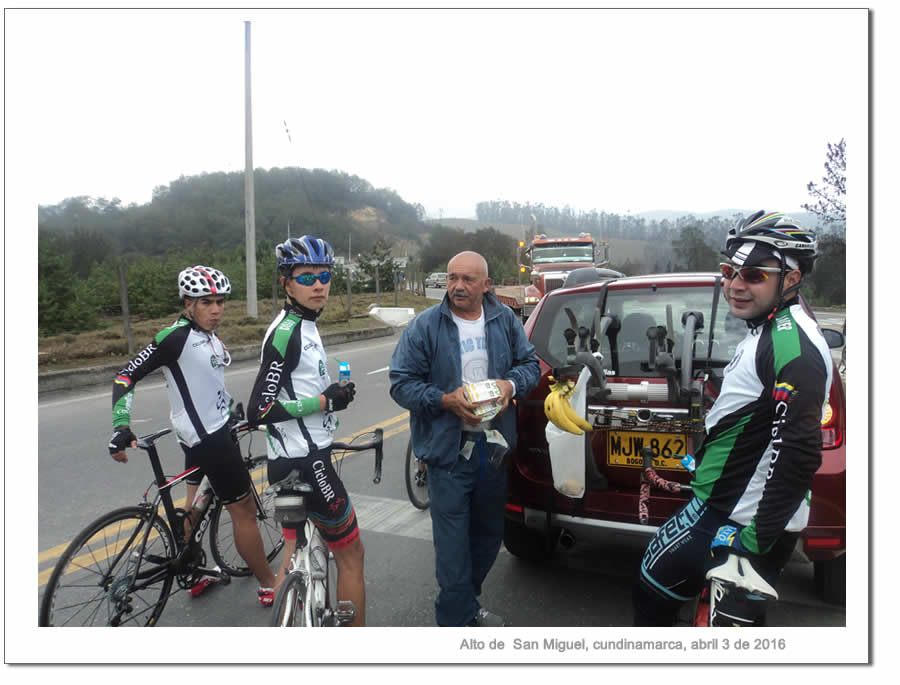 Decidido a aprovechar el día me dispuse a alistar mi recorrido, cuando de repente a mi lado gratamente vi a unos ciclistas que portaban un uniforme peculiar para mi vista, CICLOBR, ellos me miraron y reconocieron el escudo que nos cobija de una u otra forma y amablemente entablamos conversación. Inmediatamente pregunté cual sería la ruta que iban a tomar, "SIBERIA-SAN MIGUEL", me respondieron lo cual inmediatamente me desmoralizó un poco, ya que nunca había realizado una travesía tan larga. Sinembargo me dijeron que en cierto punto algunos se devolverían y que llevaban un carro acompañante por si era necesario, y con toda su amabilidad me animé a seguirlos.