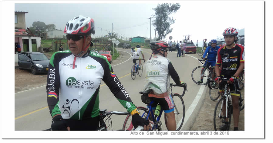 Pasando Sibaté inició la subida al Alto de San Miguel, a la rueda de Pacho y Pulga subí los 9 kmts hasta el “Alto del Cuchuco” o San Miguel. Iba escuchando como Pacho animaba a Nobile y le describía los puntos, esta es la planta de gas, esos son cultivos de fresas, arriba hay un peaje que la guerrilla ha volado como cuatro veces, “sumercé” solo faltan como uno o dos kmts, (realmente faltaban 4 y medio, pero la charla de Pacho le sirvió a Nobile).