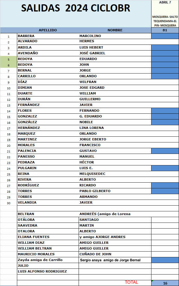 Importante enviar un saludo a nuestros compañeros: Orlando Márquez, quien por recomendación médica no nos puede acompañar por ahora, le deseamos muchos éxitos en el procedimiento que le van a realizar y recuerde que cuenta con el cariño de todos, A Wilfran que lo recordamos y extrañamos, sabemos que es un luchador y estamos seguros que pronto lo vamos a ver nuevamente rodando con la empatía que lo caracteriza, para los futuros padres: Gustavo Palencia y su esposa Estefanía, los felicitamos por él bebé que viene en camino y al abuelo Orlando Carrillo nuestras felicitaciones; nos enteramos del éxito en la cirugía de clavícula realizada a William Duarte le deseamos pronta recuperación.