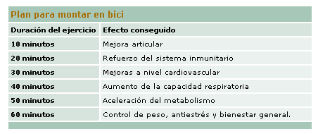 Según el Dr. Froböse, los beneficios de la bicicleta empiezan a apreciarse con los primeros 20 minutos de pedaleo. Sin embargo, lo ideal, según este mismo médico, es encontrar al menos tres huecos por semana para pedalear de 45 a 60 minutos, o "monta tan a menudo como puedas". Cuanto más tiempo dedicas a la bicicleta más ventajas vas acumulando. No hay más que fijarse en el recuadro: