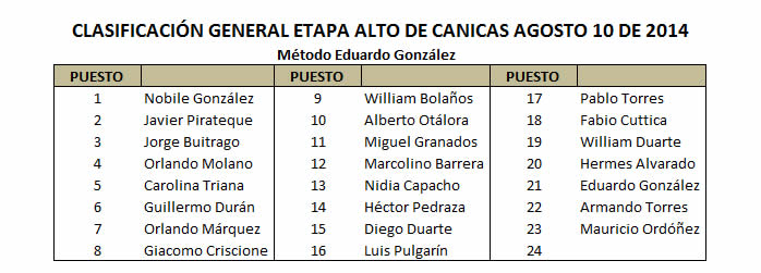 Hay carajo, casi se me olvida, me imagino que los pedalistas que participaron en la contrarreloj individual quieren conocer su tiempo y el de sus rivales, para alimentar su ego. Con el permiso del chinazo Eduardo publico el listado, pero por favor no le cuenten, si pregunta díganle que esto solo es una referencia, los resultados reales de la etapa son los que se mostraron en los párrafos precedentes.