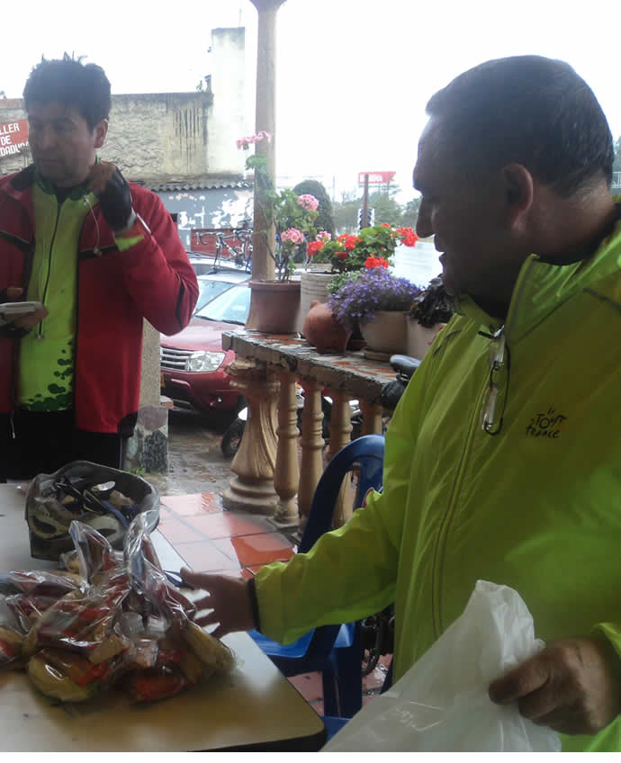 En la Caro ya estaban Don Guillermo, Mireya su señora y la nieta Alejandra; ayer me contó que la gripa lo había atrapado, pero que asistiría por cuanto tenía turno como conductor elegido. Lo que no me dijo es que con gripa y todo se fue de supermercado y que con Doña Mireya se trasnocharon preparando 25 poderosas bolsitas energéticas para cada uno de los ciclistas, creo que se pasaron de amables, incluyeron banano, maní, bocadillo, choco ramo, chocolatina, y no sé si me escapa algo más, pero pesadita si estaba, tocó consumirla en varias tandas. Para ellos un agradecimiento de todos los integrantes de CicloBR, esos son los detalles que distinguen a esta familia CicloBR.
