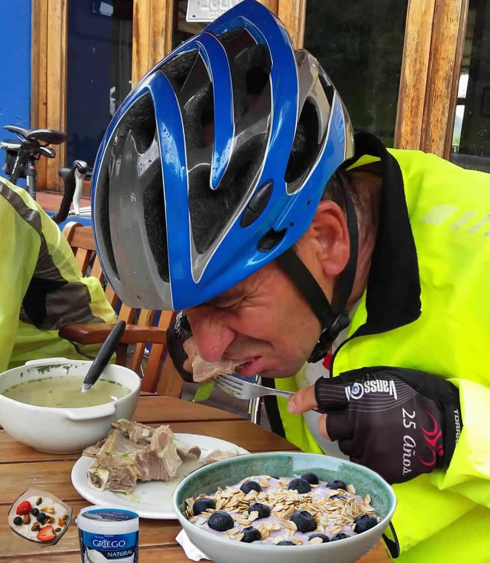 Una ligera rociada durante una parte de los 8 kmts que nos faltaban para llegar a Chocontá. Paramos en el restaurante para recargar energía como ha sido tradición, con aguadepanela en algunos casos, caldo con huevo o caldito con costilla, dieta que no recomienda Bedoya pero es lo que da la fuercita, dicen los ciclistas veteranos. Recuerdo mucho a un compañero (QEPD), el flaquito Herrera, recomendando el caldo de raíces y criadillas. No me imagino a Guillermo o al Chinazo felices desayunando con yogurth griego, hojuelas de avena y queso descremado.