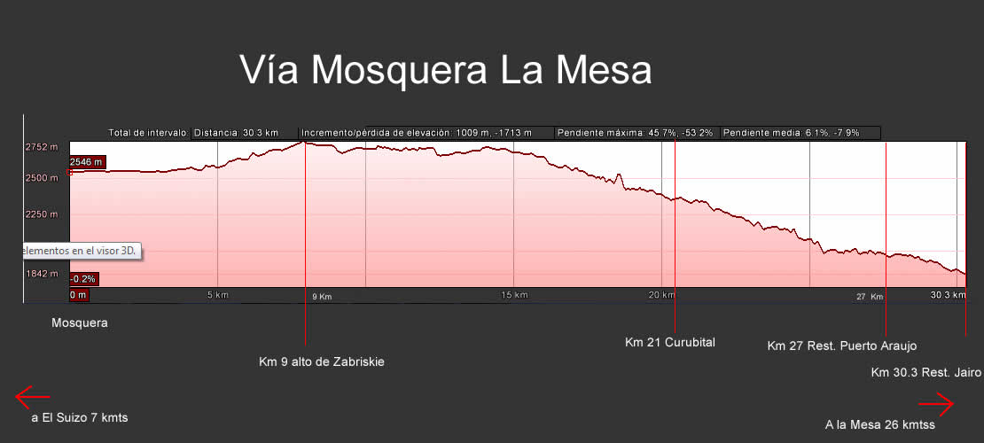 La verdad esta etapa en la vía a la Mesa () tiene un especial encanto entre los ciclistas, es un trayecto bastante quebrado que inicia con el famoso alto del kmt 9 o Zabrinskie, llamado así porque dicen que en ese desierto se filmaron unas pocas escenas de la película Zabriskie Point de los años 70 dirigida por Antonioni. La subida es exigente, sin ser extraordinariamente dura, pero tanto de ida como de regreso tiene buena dosis de montaña y al final las piernas quedan bastante resentidas, pero eso es precisamente. lo que busca un ciclista; es extraño pero si uno no llega a casa cansado siente que no hizo nada.