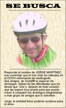 Nuevamente vimos algunos pocos ciclistas sin el uniforme programado, entre ellos Víctor Portela quien parece que tiene dificultades técnicas con su acceso a Internet y no puede consultar la programación. Les agradecemos si le colaboran con una llamada el sábado anterior para avisarle el color del uniforme.