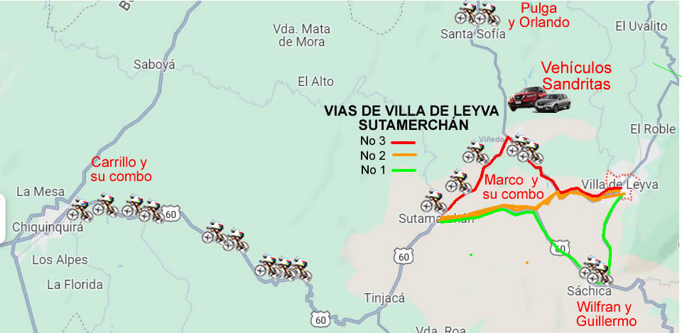 El resto, un grupo de trece, decidió adelantarse, en segundos se perdieron en el horizonte; al finalizar la etapa dijeron que la idea era esperarnos Sáchica. Lo que no sabíamos muchos es que la población cuenta con dos salidas que conducen a Sutamarchán y una de ellas no pasa por Sáchica. El grupo que partió primero tomó la salida tradicional, la que pasa por Sáchica. El grupo de Pulga, como no supo en donde giraron los primeros, preguntó a los villaleyvanos quienes les indicaron: "girar a la derecha en el primer semáforo, luego buscar un desvio donde se puede tomar a la derecha para ir a Santa Sofía o la izquierda que conecta con la principal y los saca a unos 5 kmts adelante de Sáchica". Más claro no canta un gallo.