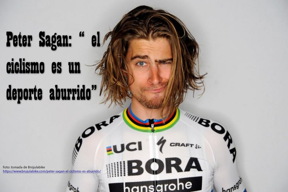 Peter Sagan: "No sé cómo explicarlo... A ver con un ejemplo: si yo miro por la tele una carrera de ciclismo de 200 kilómetros, pongo la tele a 100 kilómetros de la meta, y están siempre igual, y a 20 kilómetros de la meta, lo mismo... Pero para pasar de 100 a 20 han transcurrido dos horas, que estás delante de la tele sin que pase nada. Pero si miras solo los últimos 10 kilómetros, cinco o uno, cambia todo a toda velocidad, hasta en las etapas de sprint... Pero si lo enciendes a 100 kilómetros, te duermes, ¿no? Después, te despiertas a 10 del final y estás curioso para ver cómo termina. ¿Qué creemos que le gusta ver a la gente? No lo entiendo. Para mí es un deporte aburrido, y yo como espectador solo veo los últimos cinco kilómetros..."
