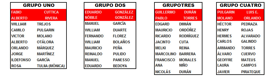Los Grupos tentativos son los que se señalan más abajo, como verán cada grupo tendrá sus líderes. Antes de que me llame alguien a decir: “oiga, esos Grupos quedaron desequilibrados”, debo a pedirles el favor de que no pensemos en competencia. Pensemos en las funciones que tendrá cada Grupo, las cuales serían en principio las siguientes: