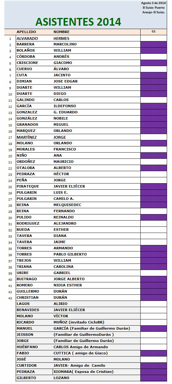 Asistieron en total 19 pedalistas: Nobile, Hermes, Luis Hebert, Eduardo y John Bedoya, Orlando C., Wilfran, Javier F., Chinazo, Orlando M. Jorge M., Pachito, Héctor, Pulga, Alberto R, Ricardo, Pablo, Armando y justo cuando íbamos a partir llegó Alberto Otálora.
