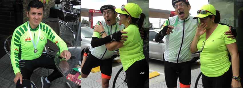 Marcolino y W. Trejos lograron coronar por delante de Pulga y de Nobile, quienes en lo más duro del ascenso comprobaron que cargar materiales para una remodelación no reemplaza el entrenamiento en ciclismo, por ahí les oí que van a aplazar la remodelación de la finquita en Viotá, guardarán el biyuyo para un viajecito a los "yunaited", que ya les hace falta.