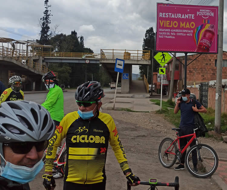 En el alto ya hay más oferta de refrescos, bocadillos, tinto y jugos para los ciclistas, una de las casetas es patrocinada por una marca de bicicletas. Descendimos hacia Cogua, bajando se da uno cuenta del mal estado de la carretera, una lástima, pero es el común denominador en estas vías secundarias. Paramos en la panadería de siempre, Pulga y Lorena no nos vieron y pasaron de largo. Pero nos esperaron en el cruce para tomar la vía a Zipaquirá, frente al negocio que colocó Mao, ni sabíamos.