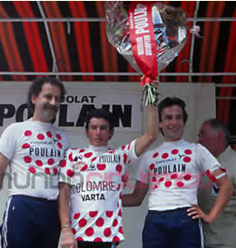 Pero los escarabajos estaban dispuestos a demostrar sus condiciones y se aguantaron el frío, el pavé que los hacía temblar y los famosos abanicos. Al comienzo perdieron mucho tiempo, pero entonces llegó la gran Montaña. El viejo Patro, (Patrocinio Jménez) tuvo al frente el famoso Tourmalet, no lo conocía pero no bien olió la montaña se paró en su Vitus y coronó de primero a un paso infernal que solo le pudo aguantar Robert Millar.