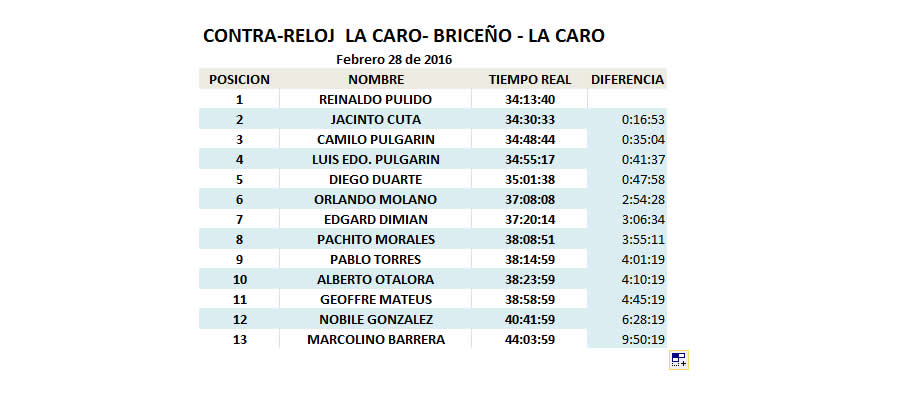 Pero bueno, lo cierto es que íbamos a cumplir con las reformas a la programación, desarrollando la competencia mensual: Domingo 28 de febrero: “Carrera contrarreloj individual –CRI-La Caro- Briceño- La Caro (21 kmts.)