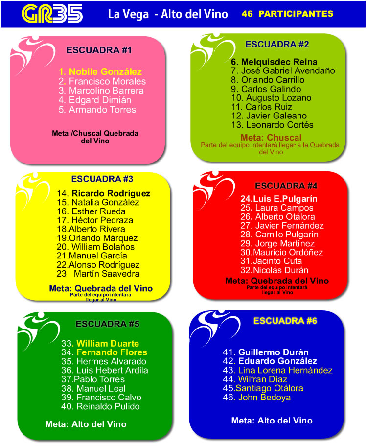 Prometimos premios especiales para las escuadras que llegaran unidas a la meta trazada, ninguna de las dos cosas se cumplió, no hubo premios y tampoco los equipos anduvieron compactos, sabíamos que la pendiente y el olor de la montaña actuarían como feromonas y sería inevitable que cada uno pensara en cumplir no solo con su reto, sino también en ganarle a su o sus rivales de turno. La idea era que cada cual se fijara su meta y disfrutara el recorrido y hasta donde sabemos eso si se cumplió al pie de la letra.