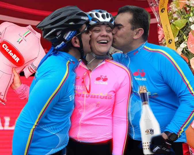 Los colombianos no solo se trajeron casi todas las camisetas, sino que probaron y bañaron al público y las modelos con Champan Astoria 9.5, el famoso espumante patrocinador del Giro, originario de Conegliano, en la región de Veneto Italia. Daba pesar tanto desperdicio y uno con ganas de probar el costoso champagne., ojalá a Giacomo se le ocurra traernos una botellitas cuando regrese de Italia,