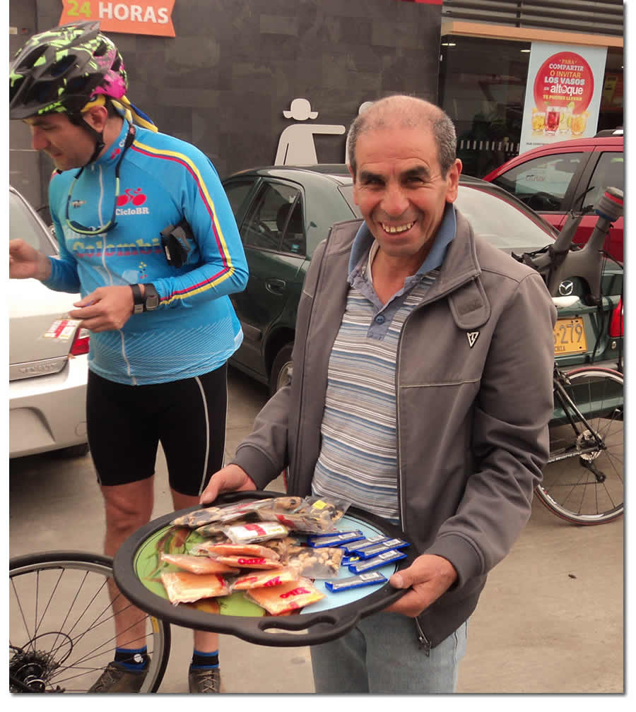 Así que el acompañamiento que hizo Eduardo, lo valoramos, tuvo que salir anoche a buscar refrigerios y sacrificó su salida, nos imaginamos la envidia de la buena que le daba vernos subiendo la cuesta del Salto Tequendama que conoce de memoria, se le hacían agua las piernas. En la bandeja de los quesos que sacó sin permiso de Marthica repartió bolsitas de maní, chocolatinas y herpos. Cargó las ruedas de repuesto, el botiquín y el inflador y cámara en mano con mucho gusto inició su tarea como escolta de sus compañeros.