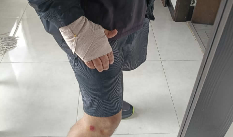 En el grupo delantero, John batió nuevamente a Javier en la llegada, infortunadamente cuando ya estaban parando Javier tropezó con la rueda de Bedoya Junior y al piso fue a dar. Sufrió algunos pequeños raspones en sus manos y en una pierna, pero parece que su mano derecha se afectó, por ahora se vendó, como aparece en la foto que compartió al llegar a casa, pero tendrá que hacerse un chequeo. Ojalá no sea nada de cuidado. Sufrió alguno