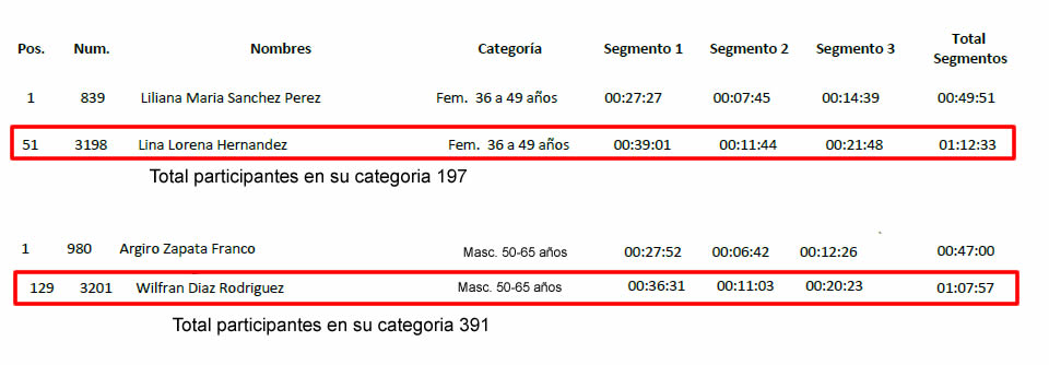 con los resultados, que nos hizo llegar el Supermán López del Team Medellin EPM. |
