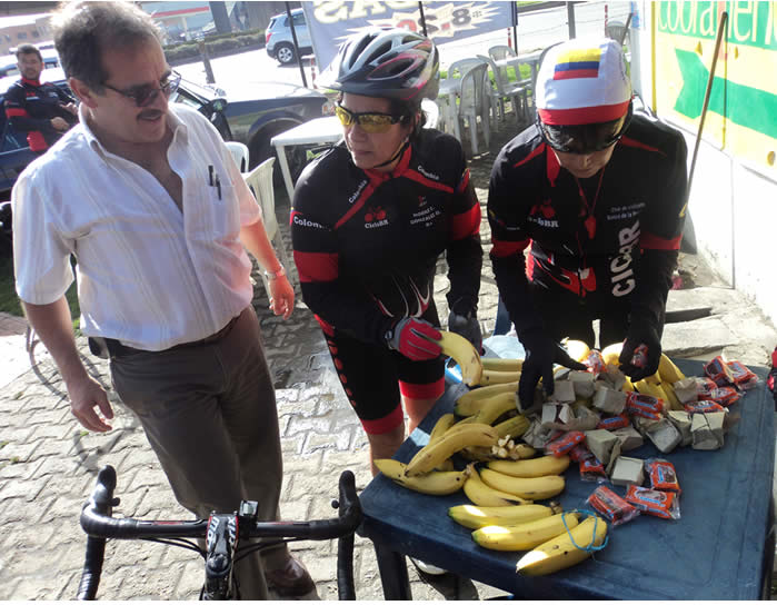 Alejandro Rodríguez, el conductor elegido de la fecha, llegó presuroso y contrató a Nobile y a Ana para que le ayudaran a “despencar” los bananos y a cuadrar por grupitos los bocadillos y chocoramos que trajo para sus compañeros. Cada uno tomó su correspondiente banano, un gran “antícalambres” y se aprovisionó de bocadillos y chocoramos para el largo camino. Gracias Alejo, por su desinteresada colaboración.