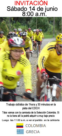 PD: Como el domingo no tenemos etapa programada debido a las elecciones y a la celebración del Día del padre (la oficial) los invitamos a todos el próximo sábado 14 de junio al Centro Deportivo Choquenzá, vamos a rodar de 8 a 9:30 a.m. en la pista, todos con la camiseta de la Selección Colombia, luego un tintico y a ver el partido Colombia- Grecia en la cafetería. Si no tienen la camiseta, tranquilos Pulga se la vende muy barata.