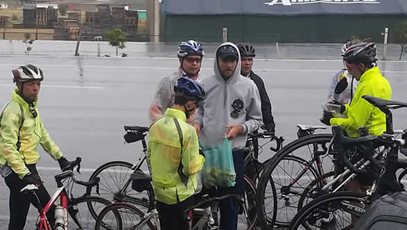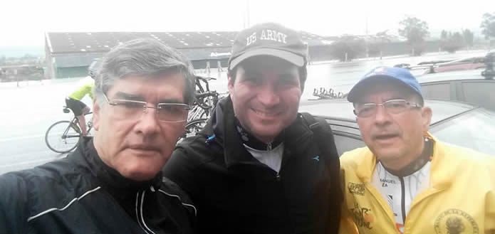 Mientras la llovizna cambiaba de intensidad aparecieron otros 19 pedalistas con lo cual completamos un grupo de 22 , todos se veían frustrados, esa etapa de Guatavita era muy esperada y preciso el clima impediría hacerla. Carolina, William, Diego, Reinaldo, Gabriel y Molanito llegaron en bicicleta, por supuesto ya se habían pegado la primera juagada, pero animaban a sus compañeros para que hicieran la etapa.