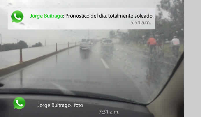 Aparece la fina llovizna, que por momentos quiere convertirse en lluvia. Alguien de la parte posterior del grupo grita: -“devolvámonos que nos vamos a lavar”. En movimiento se va haciendo un consenso y acordamos seguir hasta la subidita pasando el peaje y que el carro acompañante haga el retorno antes. Todos obedientes continuamos en nuestro cometido. Ya en Gachancipá detectamos en la distancia que la lluvia nos quiere atacar oponiéndose a nuestros intereses. Nos detenemos y buscamos alternativas. Conclusión: media vuelta y rumbo a La Caro aumentando la velocidad para que nuestra opositora no nos alcance. Y comienza a estirarse el lote con el tira y afloje de los pasistas. –“Háganle a 40-42" se escuchó.