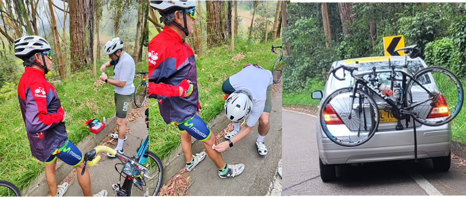 Eduardo quien anda en buena forma se vino adelante. Atrás venían Hebert y Wilfran acompañándolo. La conductora de un vehículo les informó que un ciclista con la misma camiseta nuestra se había caído más arriba. El carro acompañante se adelantó rápidamente y en efecto a falta de un kilometro para llegar a Zipacón Eduardo se le rompió la cadena en el momento en que se paró en los pedales y se cayó, sufrió varios raspones y un golpe en las costillas. El médico Juan Fernando utilizó el botiquín del Grupo y le limpió los raspones en las rodillas y la mano. Curioso pues Eduardo dice que la cadena la había comprado hace dos semanas, le tocó subirse al carro, por primera vez en su carrera ciclística.