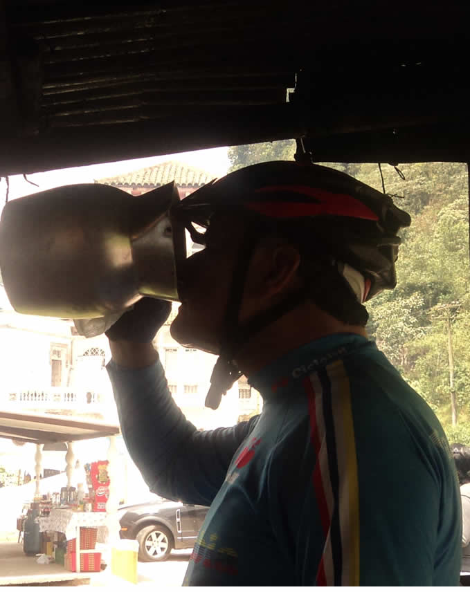 Hace unos años cuando la vía era más angosta, descubrimos ese punto, los que no queríamos bajar más parábamos en una tiendecita que quedaba a la derecha bajando justo antes de que empezara el descenso (frente a la virgen), era una casita de tejas de barro muy antigua, de paredes de adobe,con columnas de madera a las que se les notaba el paso del tiempo. Allí, nos sentábamos afuera en una silla larga construida con un tablón y antes de tomar el ascenso hacia El Vino descansábamos, nos tomábamos la Pony Malta y comprábamos los bocadillos. La primera ampliación de la vía se llevó la tiendita. Me imagino que Pulga, Miguel, Pacho, Marcolino, de pronto William Duarte y seguramente nuestros colegas de ese tiempo el abuelo y Jorge Sánchez la recuerden. Qué tiempos aquellos cuando descansábamos en la mitad de cada etapa.