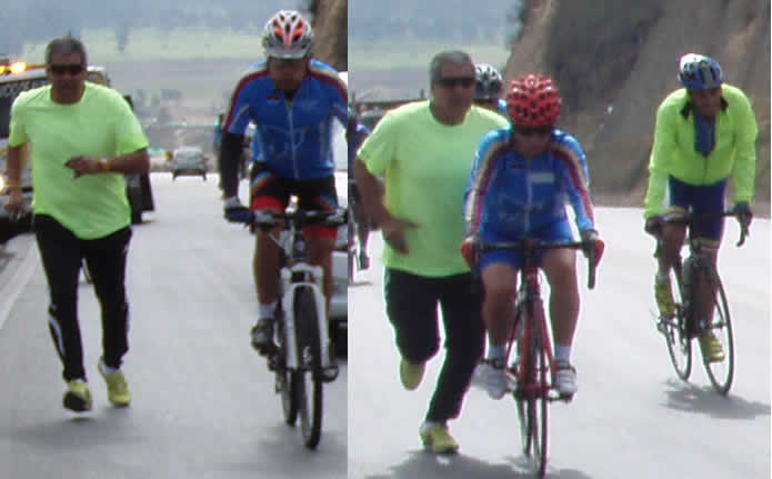 Los partimos del Suizo. Pasamos el puente sobre el pestilente rio Bogotá y luego el peaje, así conversando, conversando llegamos al inicio de la subida al Km 9 de la vía a la Mesa, donde nos teníamos que aplicar la primera dosis de montaña. Es una subida de 3,5 kmts, de pendiente no muy exigente pero que tiene su “tumbao”. Carolina picó en punta, aprovechando el descuido de sus compañeritos y luego se hizo inalcanzable, eso pasaba jóvenes y viejitos a la lata. William y Javier se dieron cuenta tarde y aunque pasaron como motos no le pudieron llegar, allí estaba arriba sonriente esperándolos.