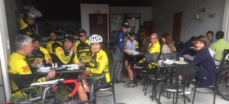 De esta manrea los once arriesgados que se le midieron al “ciclo paseo” se dieron cita a las 7:00 a.m. en la “Y” pasando el instituto Franklin D. Roosvelt en el kilómetro cero de la subida hacia Choachí. A las 7:30 a.m. partimos rumbo al Páramo en cuatro vehículos, el de Alberto Rivera, el de Marcolino, el de Pulga y el del Chinazo Eduardo. Llegamos al Parador Colombia punto ubicado a 3.367 mts sobre el nivel del mar, el más alto en el ascenso desde Bogotá, donde a pocos metros comienza el descenso hacia Choachí. Allí dejamos dos vehículos, en los cuales bajamos Marcolino, Pulga, Eduardo, Nobile, O. Márquez y W. Duarte, Martha la esposa de Eduardo y una de sus hijas, Katherine la novia de Giaco. Fabio, Giaco, Camilo, Alberto R. y Francisco Ruiz bajaron en sus bicicletas.