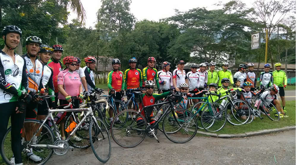 La caravana multicolor de 31 ciclistas, entre quienes estaba nuestro ciclista Decano Jorgito Peña, acompañada de los vehículos de familiares acompañantes recorrió el primer tramo hasta Mariquita. Justo al tomar la vía a Manizales encontramos piso húmedo y cielo cubierto, aún caían algunas gotas de agua, residuos de un aguacero recién finalizado.