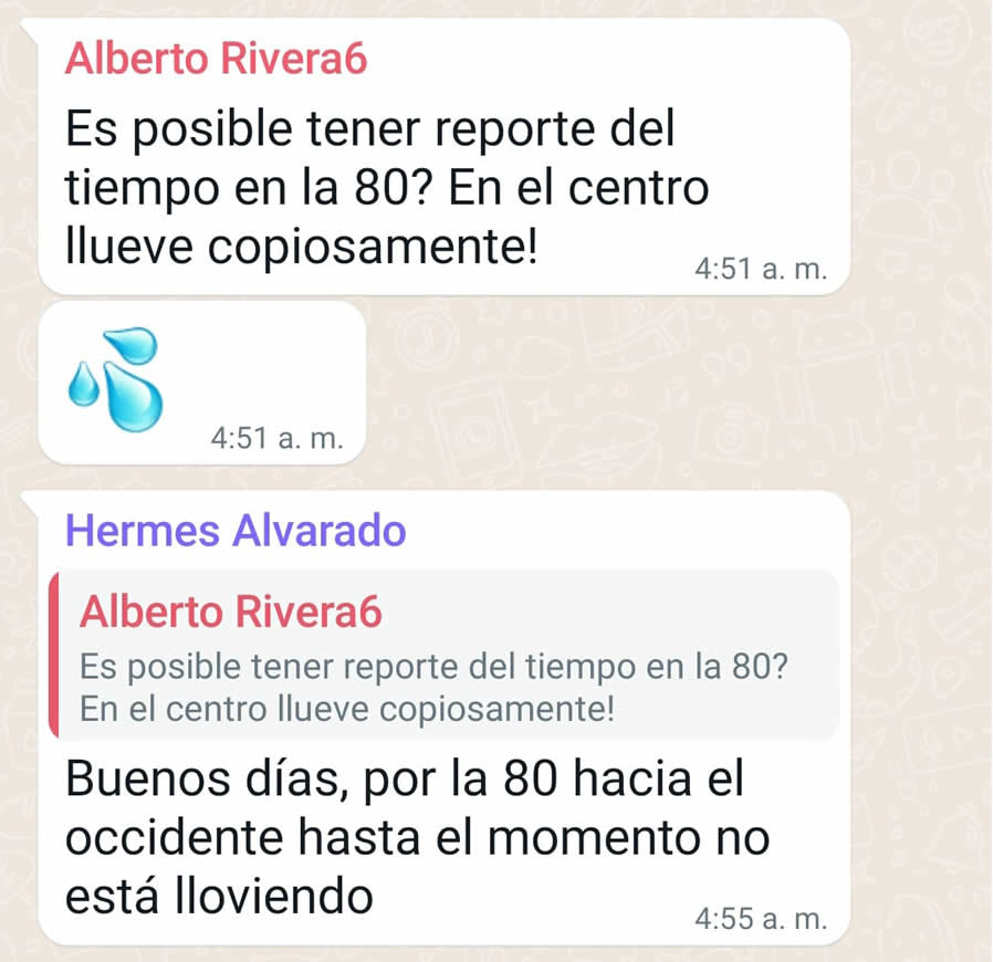 Qué pena Hermes que lo hubiéramos despertado, eran apenas la 4:51 a.m. Nos sorprendió que apenas cuatro minutos después respondió con un parte de tranquilidad, informando que por la 80 hacia el occidente no estaba lloviendo. Gracias Hermecitos Ud. al igual que el coronel Juan José Rendón en la Batalla del Pantano de Vargas Salvó la Patria.