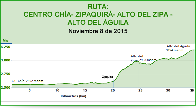 Un descenso inicial luego del Zipa, bastantes columpios y repechos, una buena cantidad de taches reductores de velocidad en la vía fueron el menú en los siguientes 10 kmts y entonces la carretera pica hacia el cielo y nos exige al máximo en el kilómetro final, lo cual indica que ya estamos próximos al Alto del Águila, a donde llegamos todos los 22 sobrevivientes “desentrenados”.